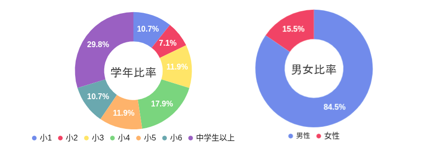 プログラミング教室は男の子ばかりのイメージがありますが、当校では約2割弱は女の子。また、学年では小学生の各学年均等にご在籍いただいているとともに、中学生以上の長くご在籍いただいているお子様も約3割となっています。(2025年12月現在・篠原橋センター校/みどり徳重センター校)