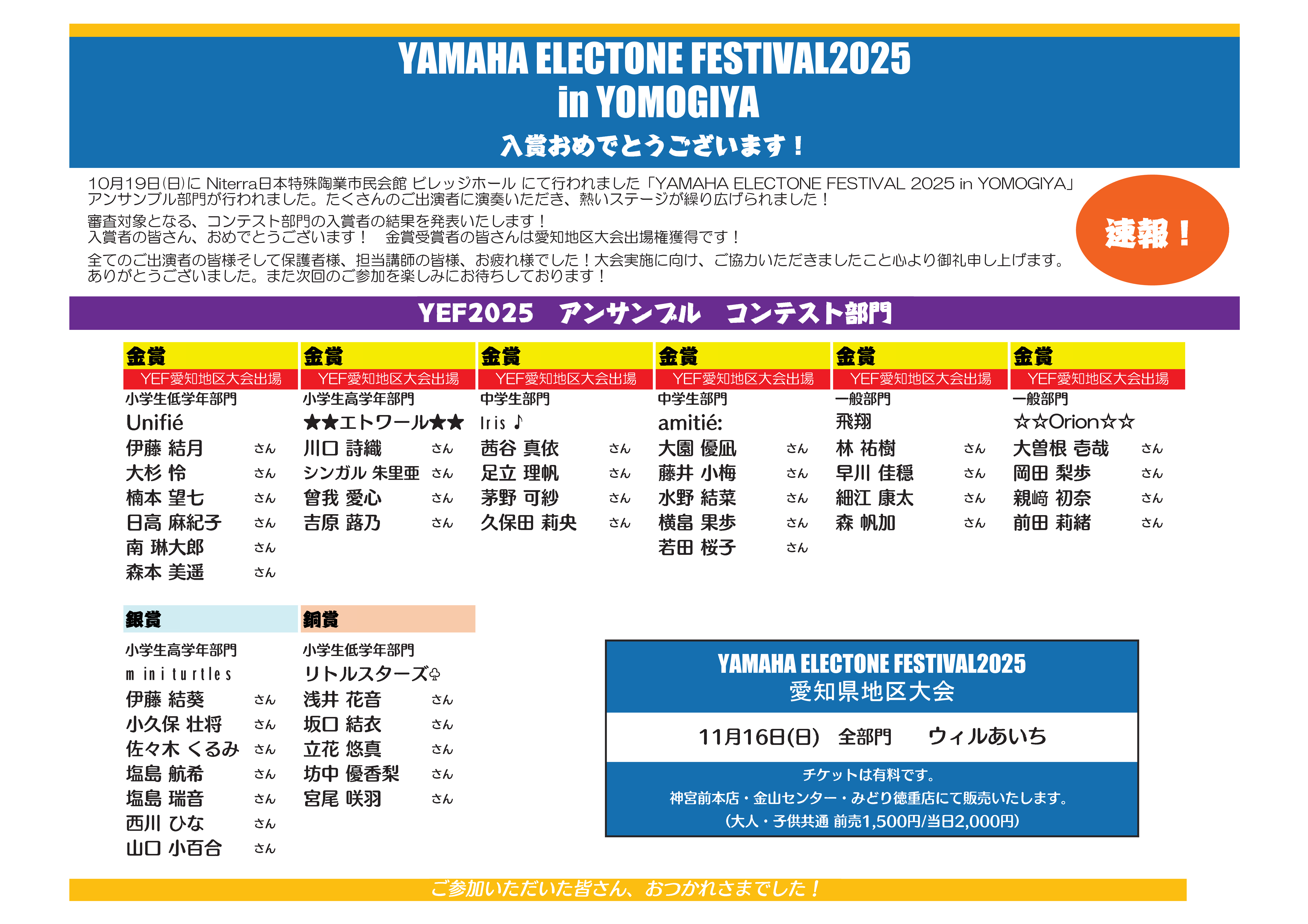 - 2025年10月21日YAMAHA ELECTONE FESTIVAL 2025 in YOMOGIYA アンサンブル演奏部門 結果発表